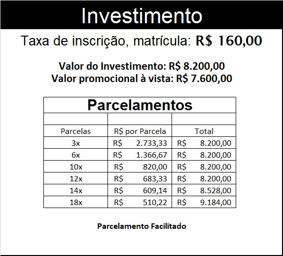 Serão 11 módulos presenciais mensais. Um final de semana por mês das 9h as 18h ambos os dias. Módulos ministrados por professores diferentes.